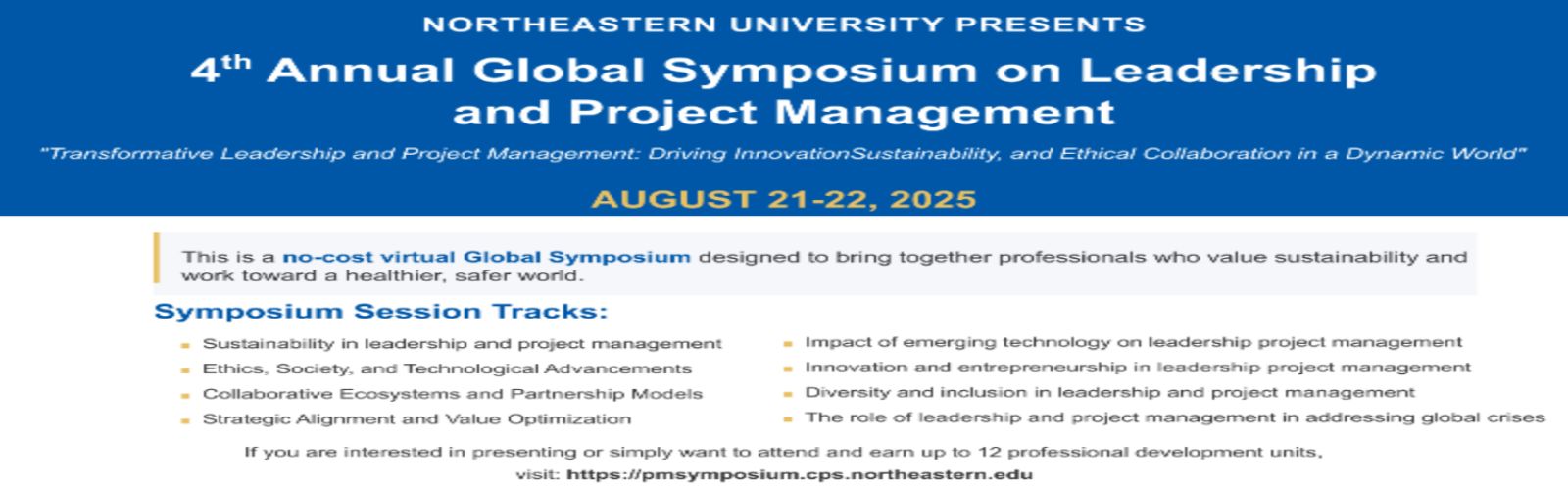 The 2025 Northeastern University Global Symposium on Leadership & Project Management took place on August 21-22, 2025. For more information, visit pmsymposium.cps.northeastern.edu. You can also view my profile at the symposium website pmsymposium.cps.northeastern.edu/kwabena-asante
